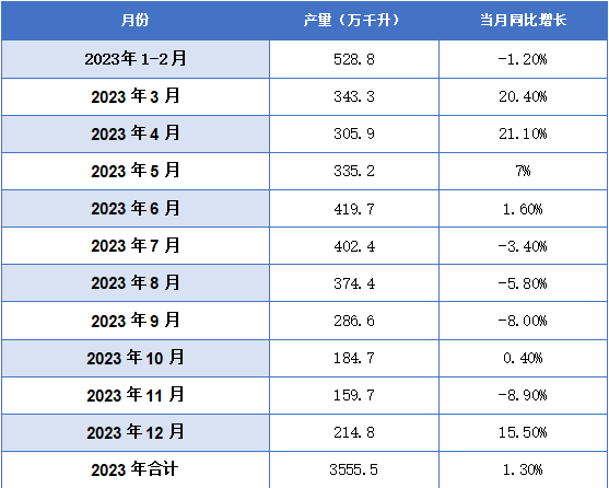 2023年1-12月,中國規模以上企業啤酒產量3555.5萬千升,同比增長0.3%。
