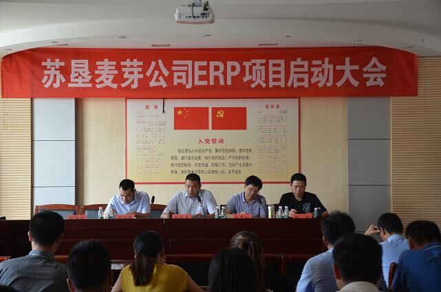 7月27日,蘇墾麥芽公司召開ERP項目啟動大會,公司董事長、總經理郭世平作重要講話,會議由公司財務總監朱恩桂主持,用友軟件合作伙伴慧建網絡公司李維雷總監、蘇墾麥芽公司總工程師張明以及班組長以上管理人員參加了會議。