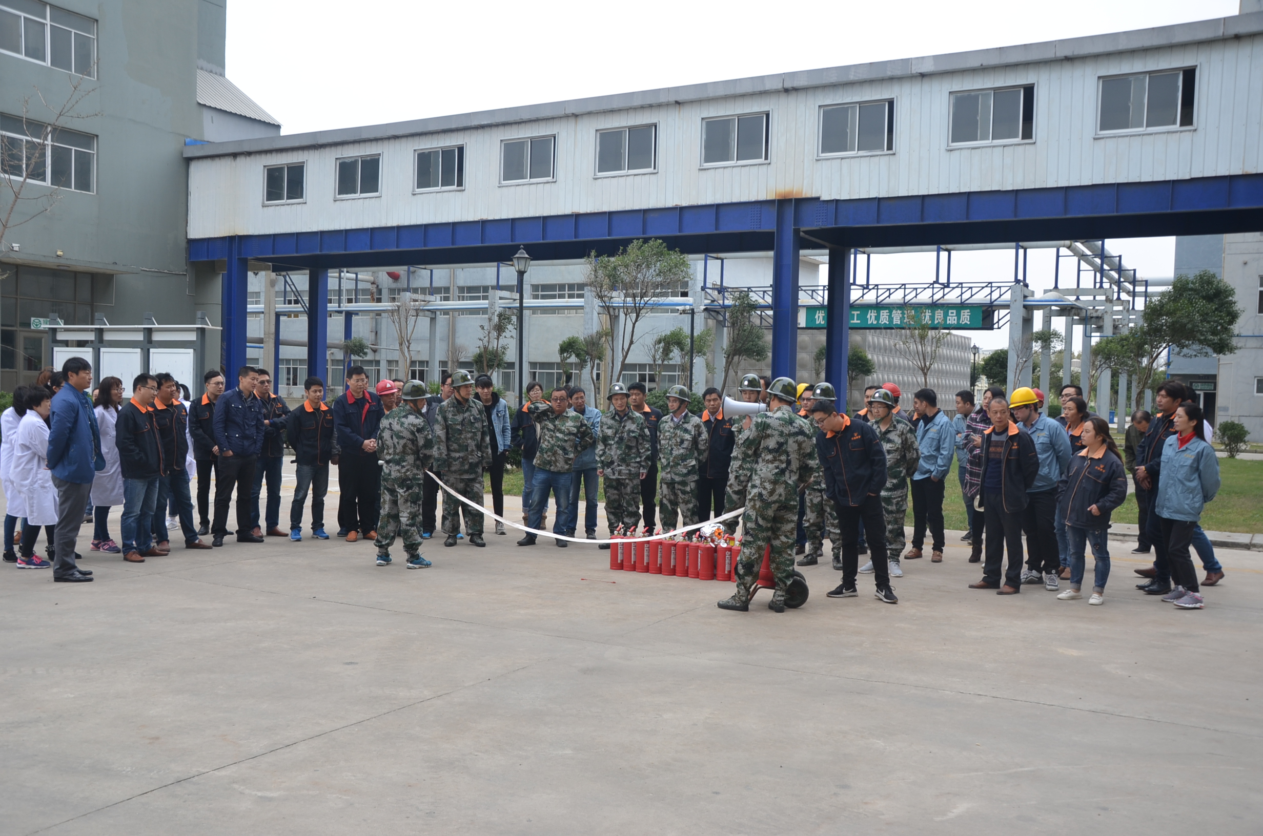 此次演習(xí)主要有模擬起火前期救援、緊急疏散、液氨泄漏緊急處置等內(nèi)容。演練模擬工作塔二樓起火,全體員工聽到警報聲后,用毛巾迅速捂住口鼻,屈身前行,迅速撤離到安全區(qū)域,消防人員進(jìn)行著火初期的滅火并將圍困在二樓的人員迅速組織撤離。整個演習(xí)反應(yīng)迅速,處理到位,配合有序,取得圓滿成功。