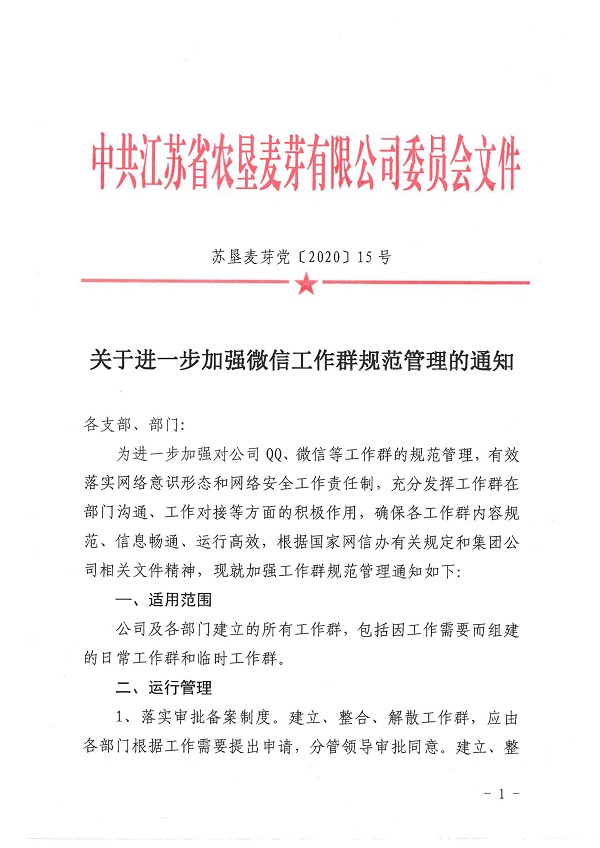 為進一步加強對公司QQ、微信等工作群的規范管理,有效落實網絡意識形態和網絡安全工作責任制,充分發揮工作群在部門溝通、工作對接等方面的積極作用,確保各工作群內容規范、信息暢通、運行高效,根據國家網信辦有關規定和集團公司相關文件精神,蘇墾麥芽公司下發《關于進一步加強微信工作群規范管理的通知》并組織相關部門人員對基層員工進行宣講教育,共同營造良好的網絡環境。