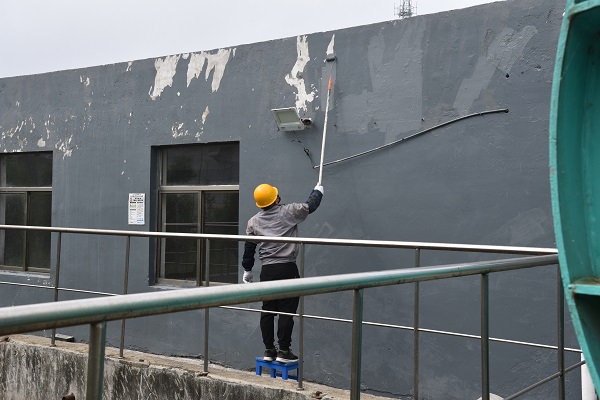 上午,制冷、水處理班組根據工作計劃安排,對公司污水處理站外墻面進行自主維護。他們利用自學的零星土建和防腐施工工藝知識,用混凝土對污水處理站破損的外墻面進行找補、修復。這是該班組組織的又一次污水處理站外墻墻面美化行動。