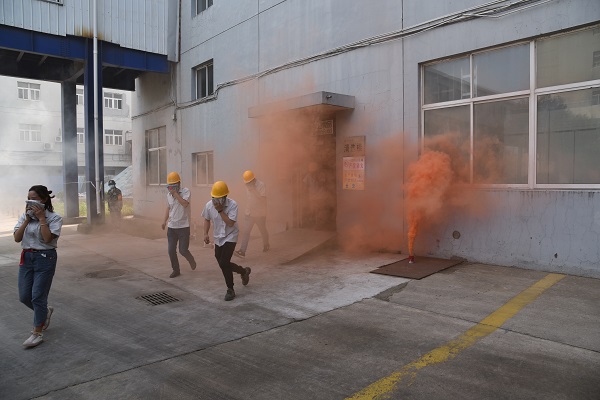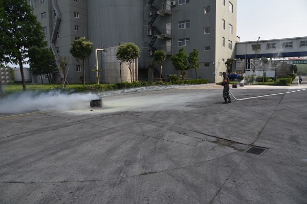演練由公司安全總監侍廣洲主持,張明致開幕辭。侍廣洲向全體參演人員詳細講解消防器材、滅火器以及防毒面具、防化服的性能及使用方法。隨后演練正式開始,火情警報響起后,在演練總指揮“啟動應急預案”的命令下達后,應急救援人員有序組織大樓里的員工迅速反應,用濕毛巾捂住口鼻,在濃煙中伏低身體沿著逃生通道有序撤離。疏散完成后,接下來便是消防實戰演練,大家拿著滅火器,站在上風向,對著火苗根部摁下滅火器手柄,迅速撲滅大火。在場每個員工都參與其中,真實體驗消防器材的使用和操作程序。在液氨泄漏事故應急演練中,演示人員穿上特殊防化服,帶好防毒面具,沖進演練現場展開應急救援。