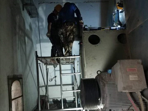 圖為王小軍、姜錚、劉度在4#烘干風(fēng)機室內(nèi)抓緊更換風(fēng)機軸承。
