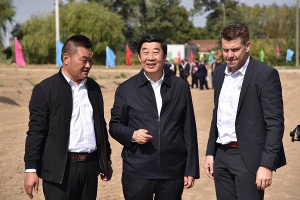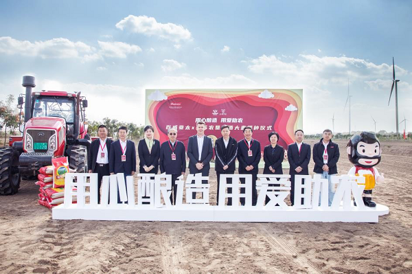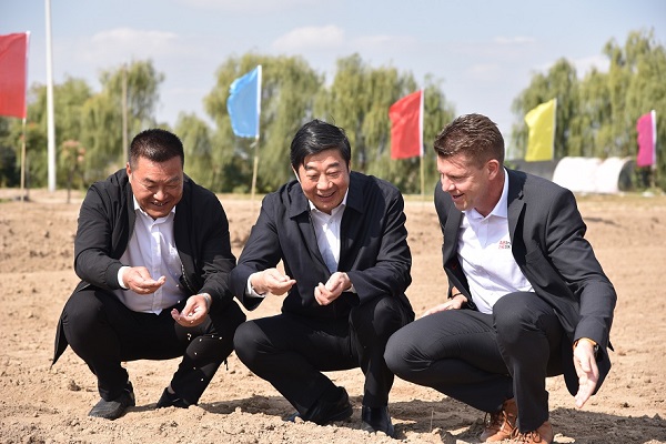 江蘇省農(nóng)墾集團(tuán)有限公司總經(jīng)理胡兆輝(中)、百威亞太采購及可持續(xù)發(fā)展副總裁楊凱與農(nóng)民代表共同播下大麥種子