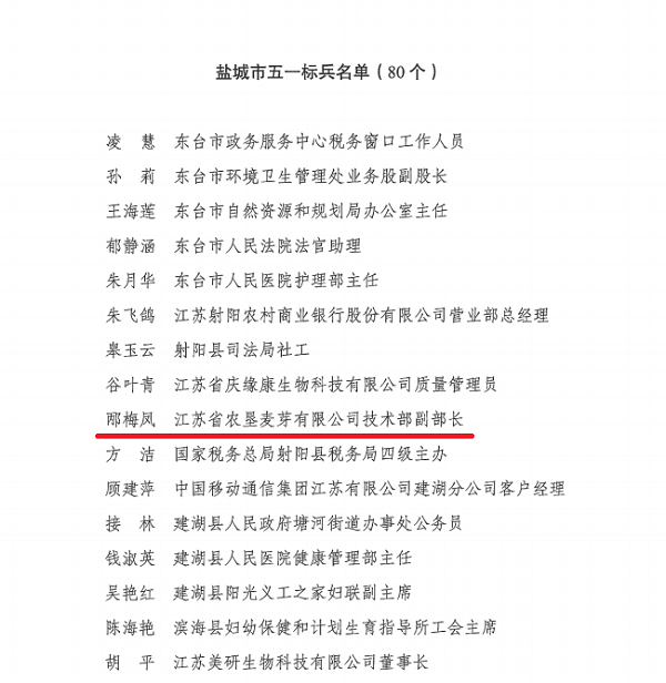近日,蘇墾麥芽公司員工邴梅鳳獲得“鹽城市五一巾幗標兵”榮譽稱號。
